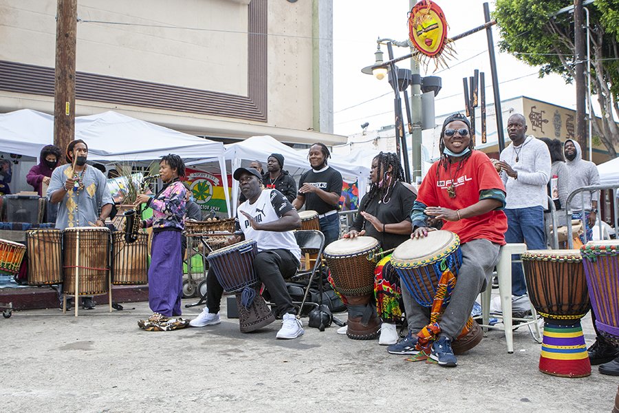 Community members performing in the weekly drum circle in Leimert Park Village Plaza (via Los Angeles Standard Newspaper).
